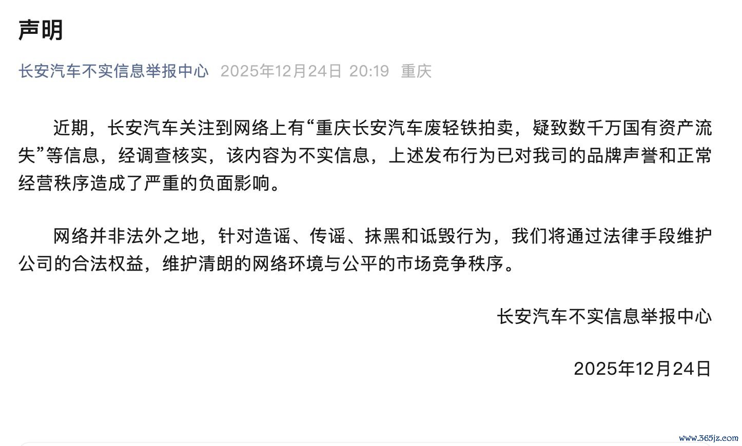 12月24日晚,长安汽车作假信息举报中心发布声明称,近期,长安汽车关心到积累上有“重庆长安汽车废轻铁拍卖,疑致数千万国有钞票流失”等信息,经看望核实,该施算作作假信息,上述发布行动已对公司的品牌声誉和闲居探讨次序酿成了严重的负面影响。针对责骂、传谣、抹黑和漫骂行动,公司将通过法律技术爱戴公司的正当权柄。